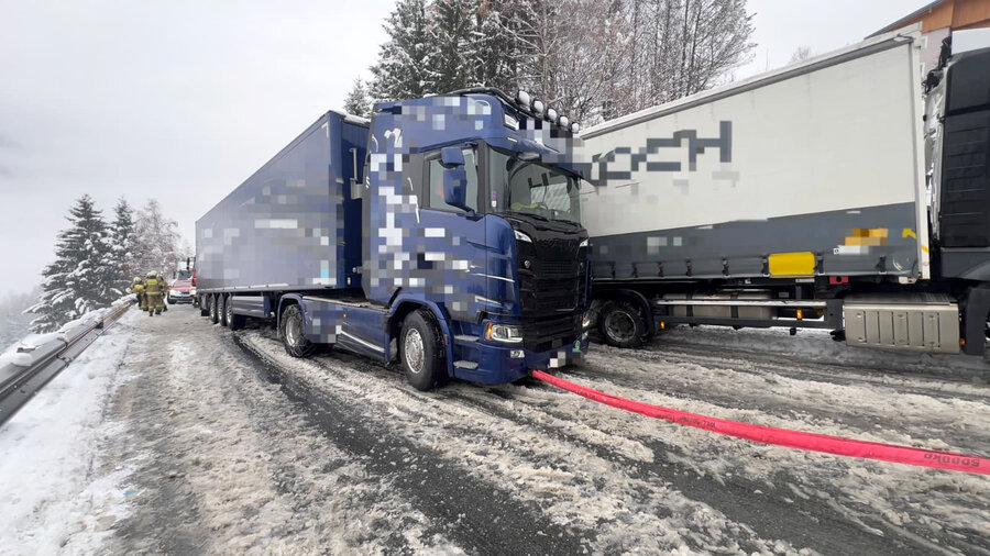 Um 13:01 Uhr wurde die Feuerwehr zu einer Fahrzeugbergung auf die L109, Straßenkilometer 3,8, alarmiert. Ein ohne Schneeketten Richtung Großarl fahrender Sattelzug touchierte aufgrund der winterlichen Straßenverhältnisse mit dem Aufleger seitlich ein in einer Ausweiche abgestelltes weiteres Sattelkraftfahrzeug. In der Folge verkeilten sich die beiden Schwerfahrzeuge und mussten mittels Seilwinde getrennt und danach geborgen werden. Während der Bergung war die Landesstraße für den gesamten Verkehr gesperrt.