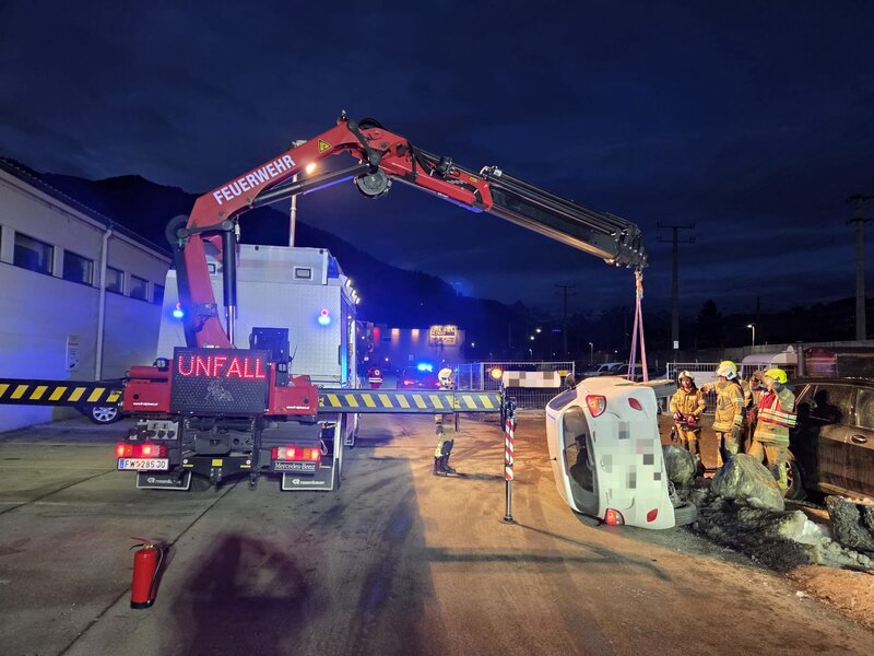 Um 17:40 Uhr wurde die Feuerwehr über Sirenenalarm zu einem Verkehrsunfall mit eingeklemmter Person auf die Bundesstraße alarmiert. Ein Pkw war nach einer Kollision mit neben der Zufahrt zum Dieselkino aufgestellten Wasserbausteinen umgekippt und in der Folge auf der Fahrerseite zum Liegen gekommen. Glücklicherweise war eine Personenrettung durch die eingetroffenen Feuerwehrkräfte nicht mehr erforderlich. Einsatzmaßnahmen waren die Absicherung der Unfallstelle, das Binden von ausgeflossenen Betriebsmitteln sowie die Bergung und Aufrichtung des Unfallfahrzeuges mittels Bergkran.